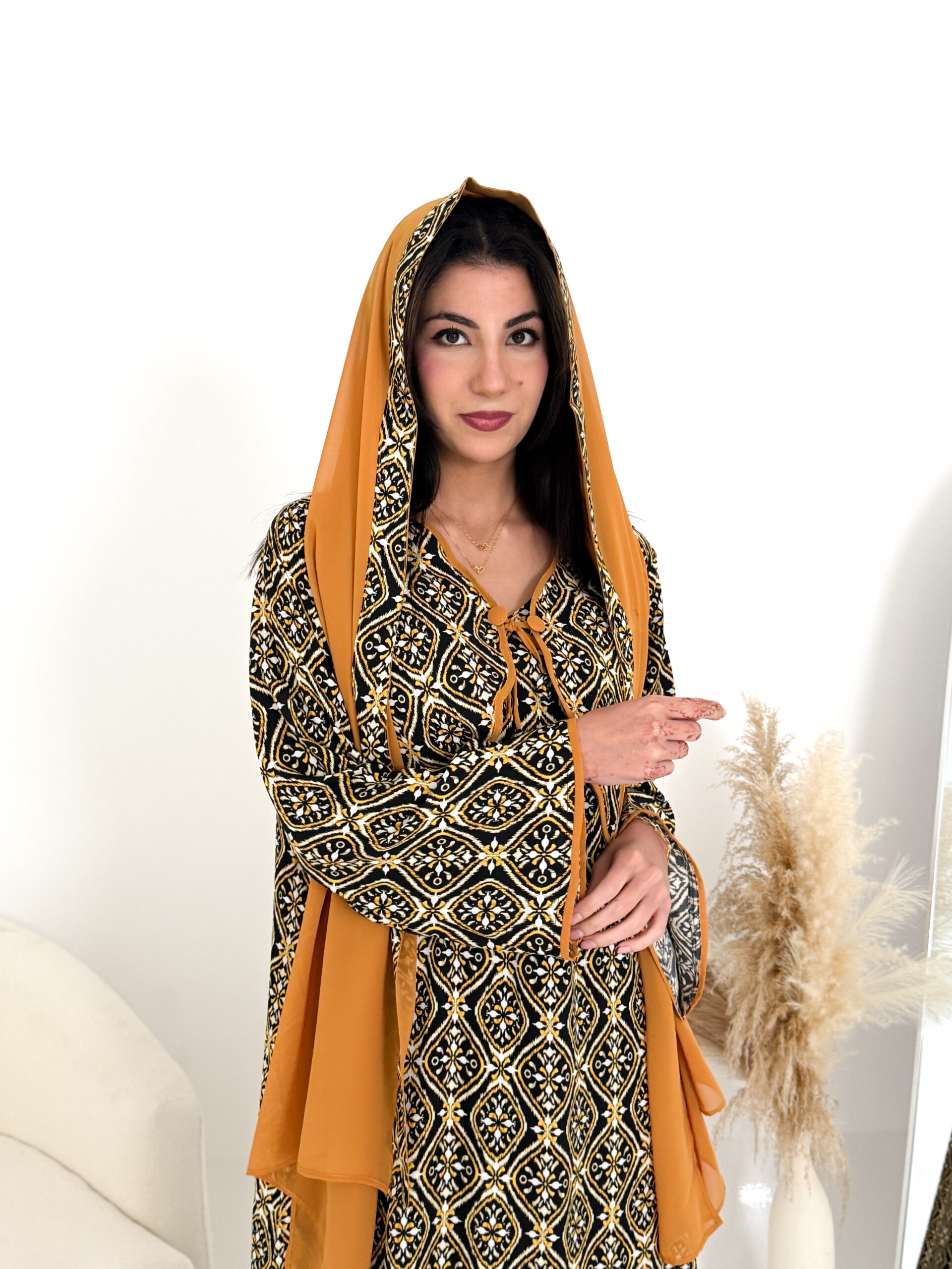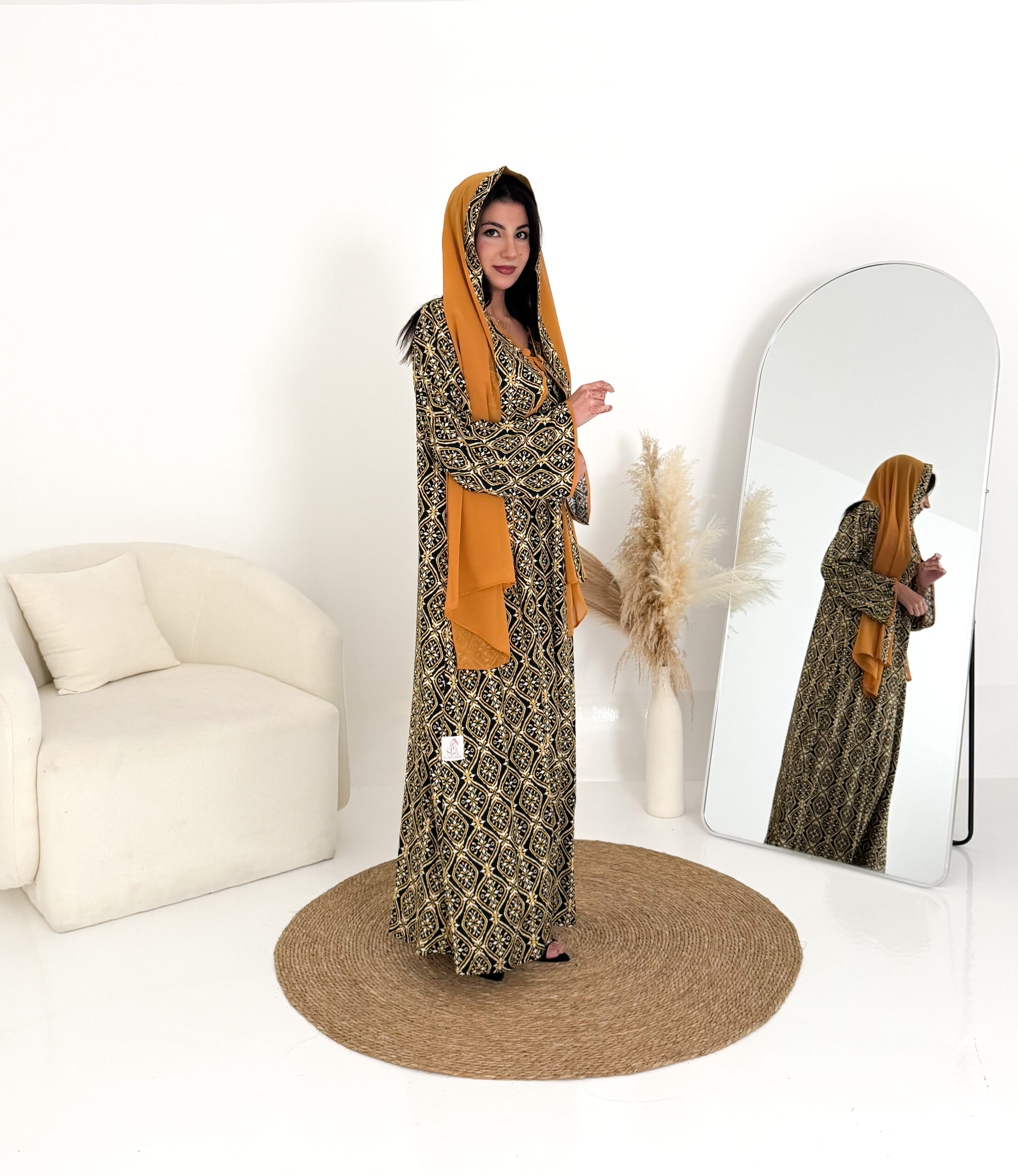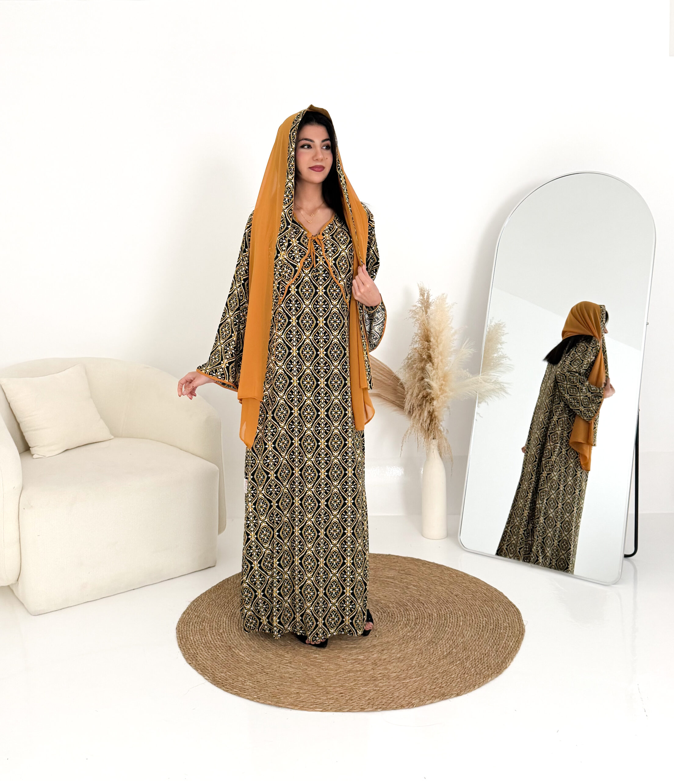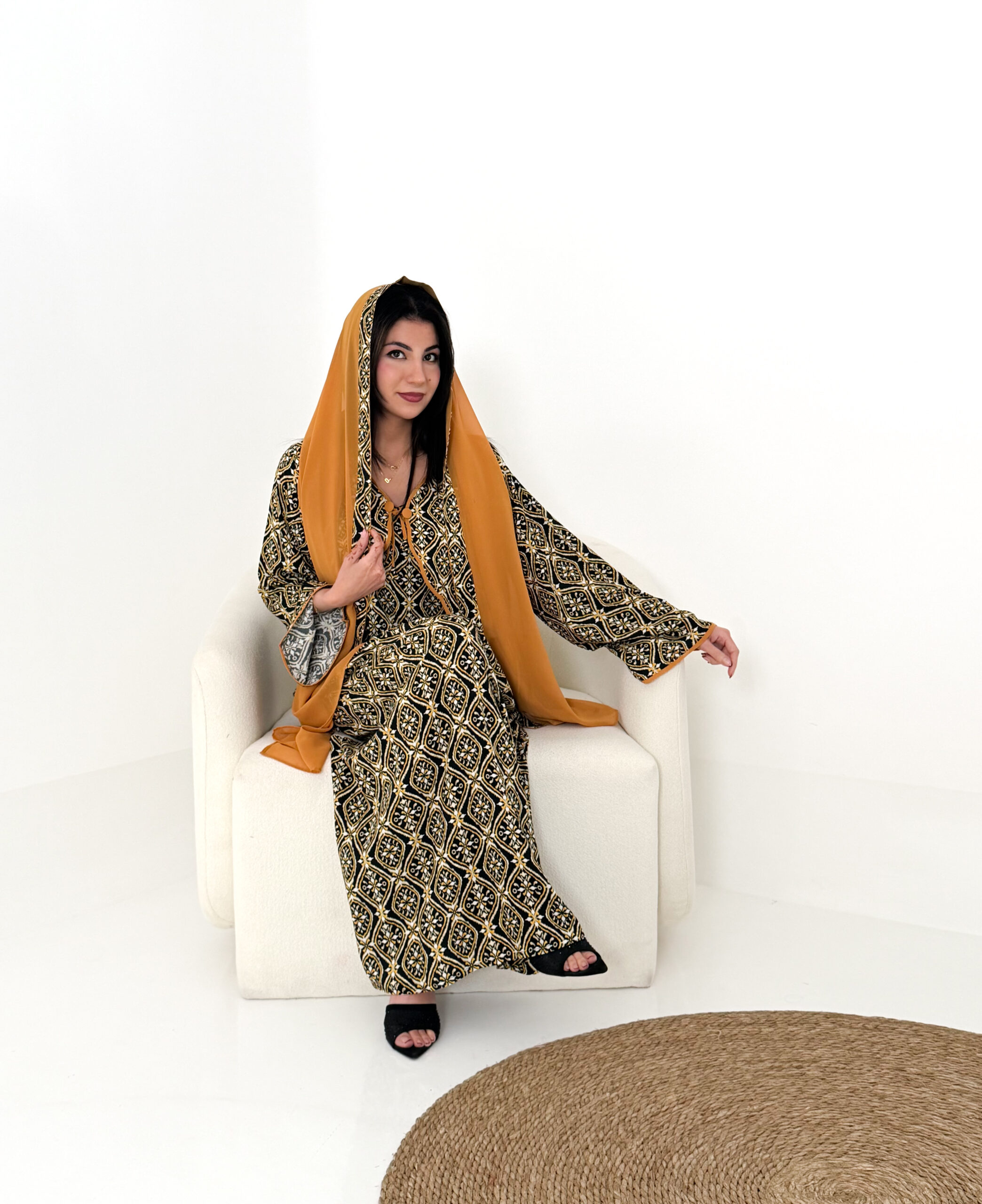 تصميم عملي وأنيق يمنحك الراحة طوال اليوم، ويأتي معها شيلة شيفون خفيفة تكمل إطلالتك بلمسة ناعمة