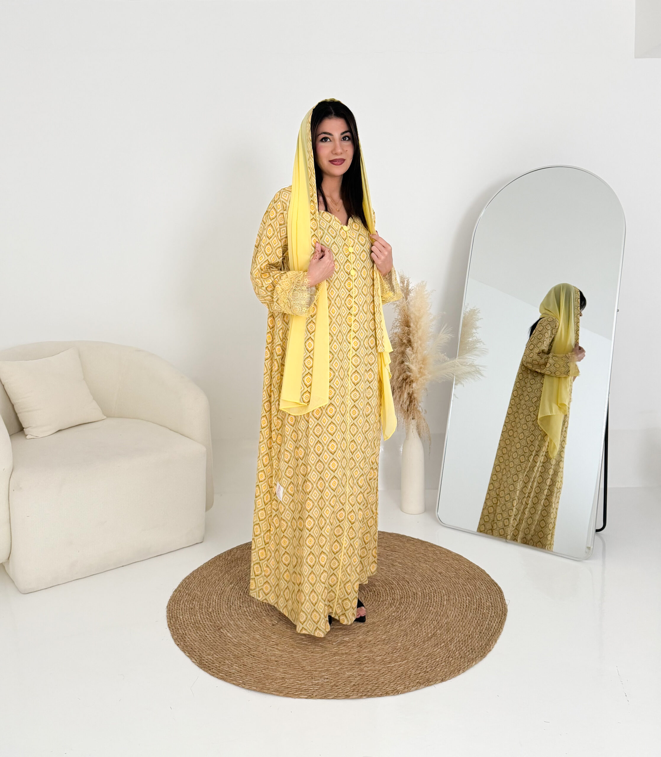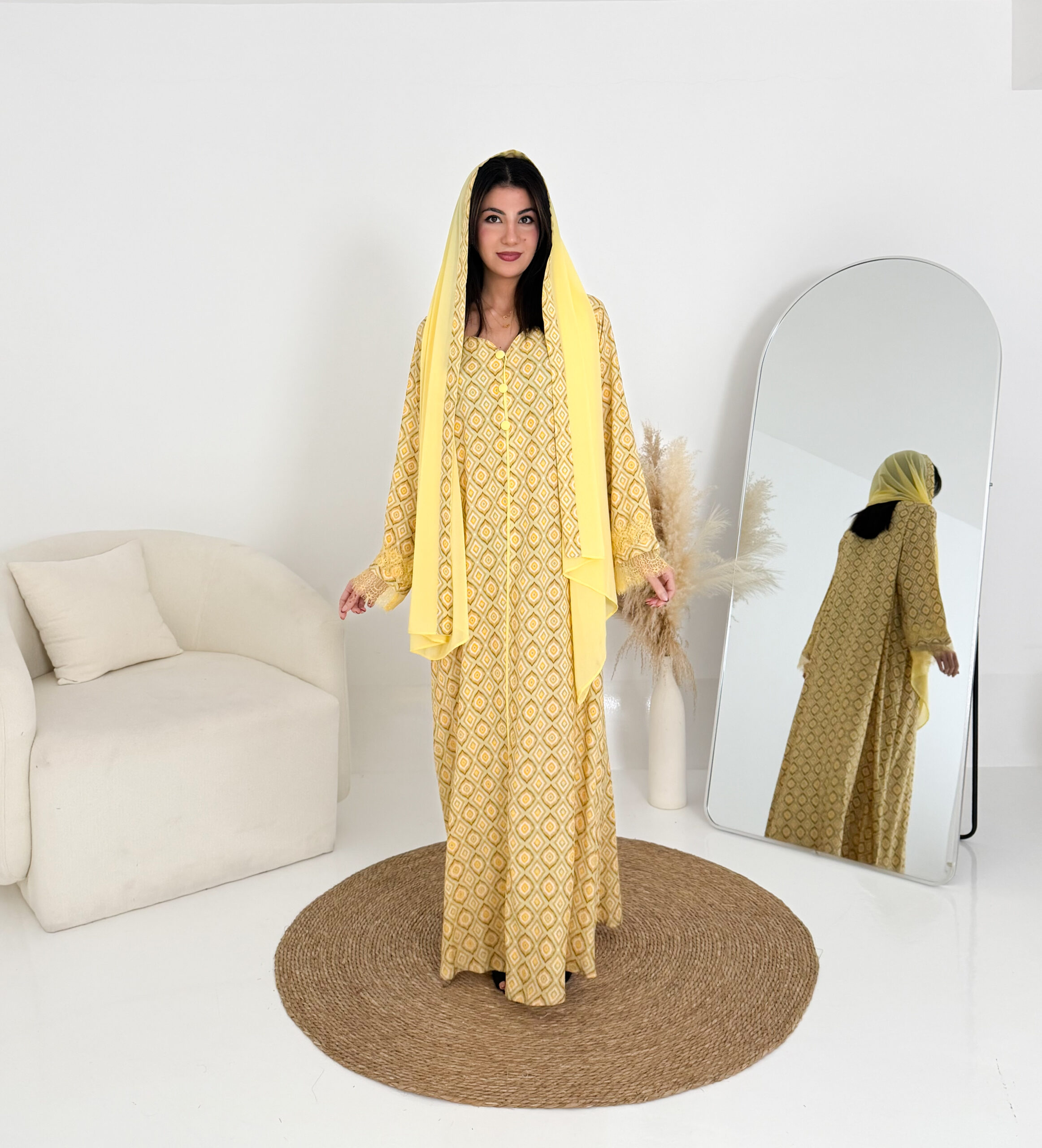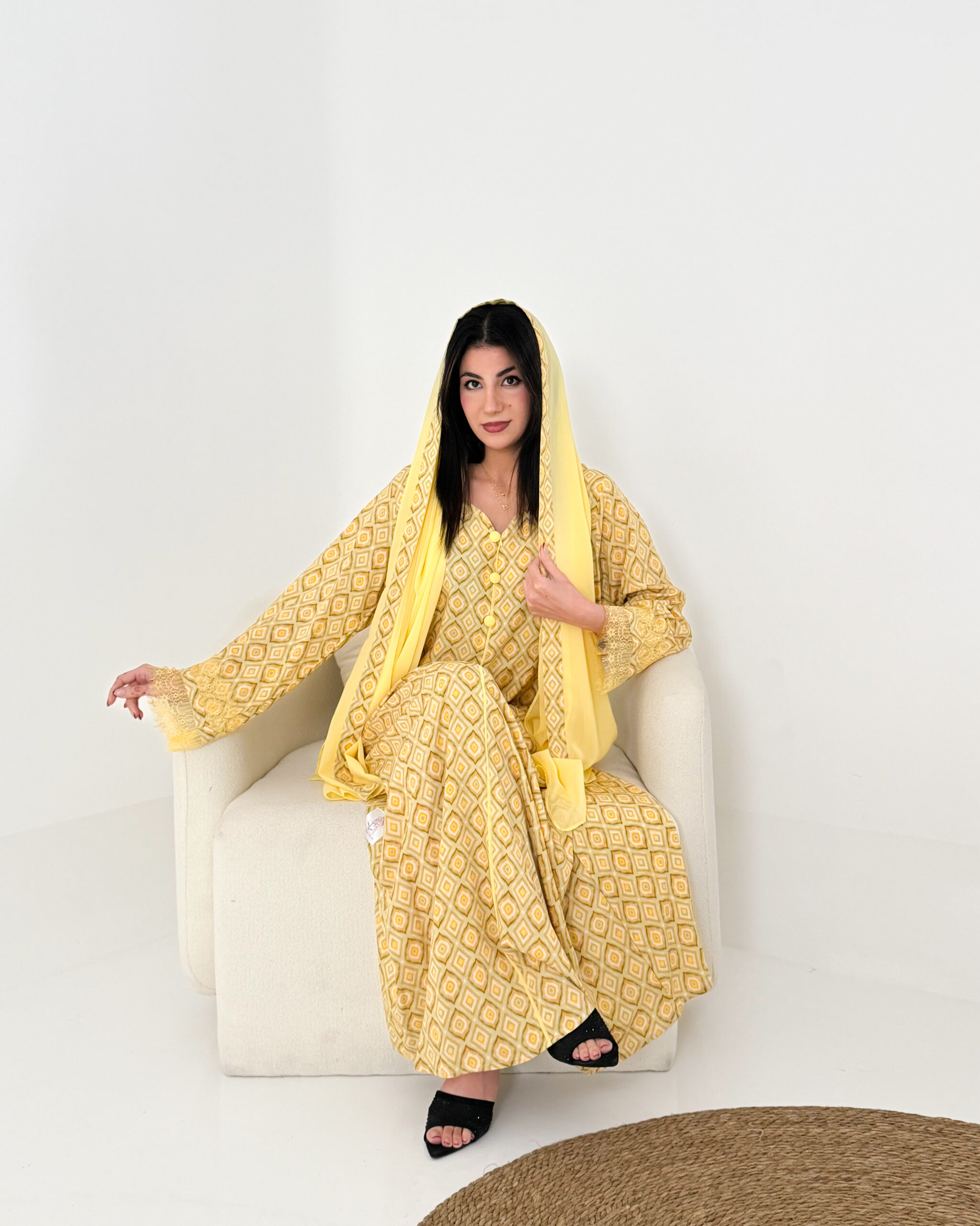 تصميم عملي وأنيق يمنحك الراحة طوال اليوم، ويأتي معها شيلة شيفون خفيفة تكمل إطلالتك بلمسة ناعمة، كما زُيّنت الأكمام بدانتيل فرنسي فاخر ليضيف لمسة أنثوية راقية.