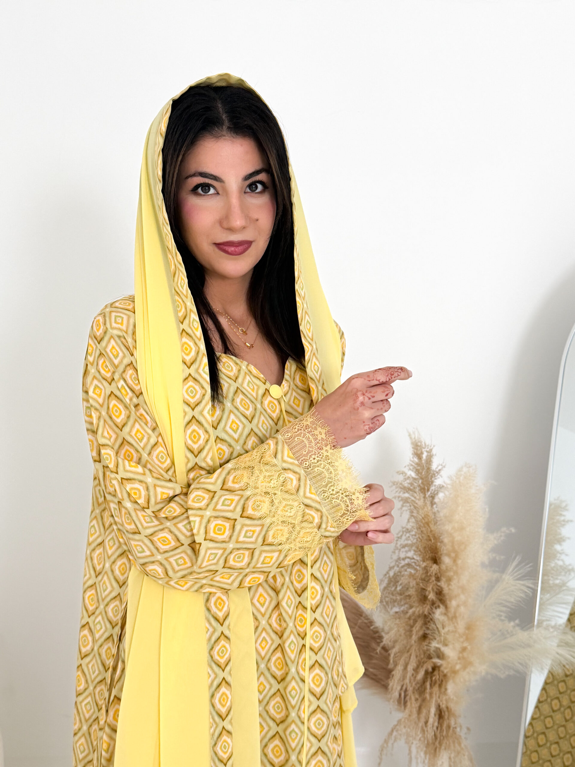 A practical and elegant design that keeps you comfortable throughout the day, complemented with a light chiffon sheila for a soft, refined look. The sleeves are adorned with delicate French lace, adding a graceful and feminine touch.