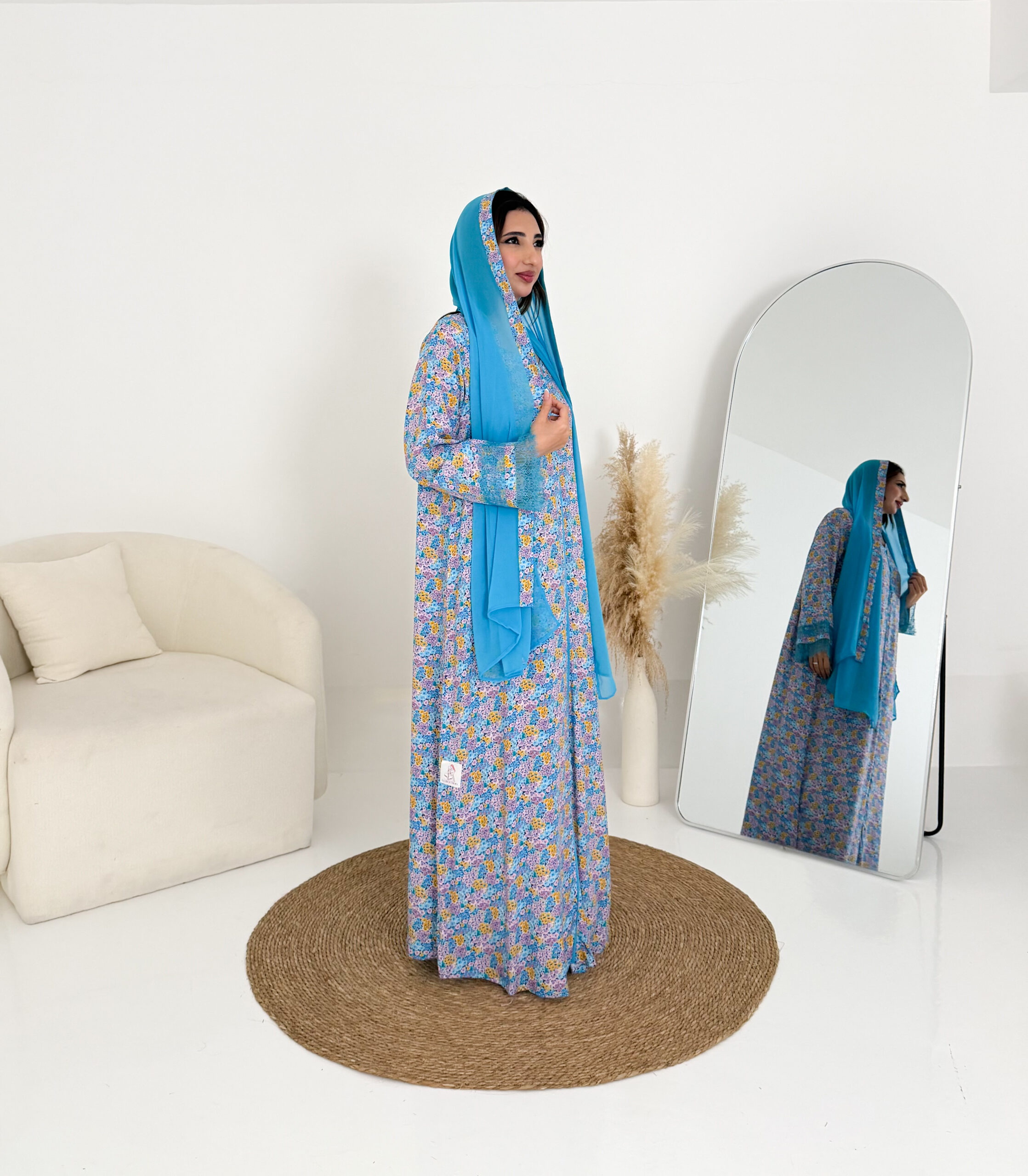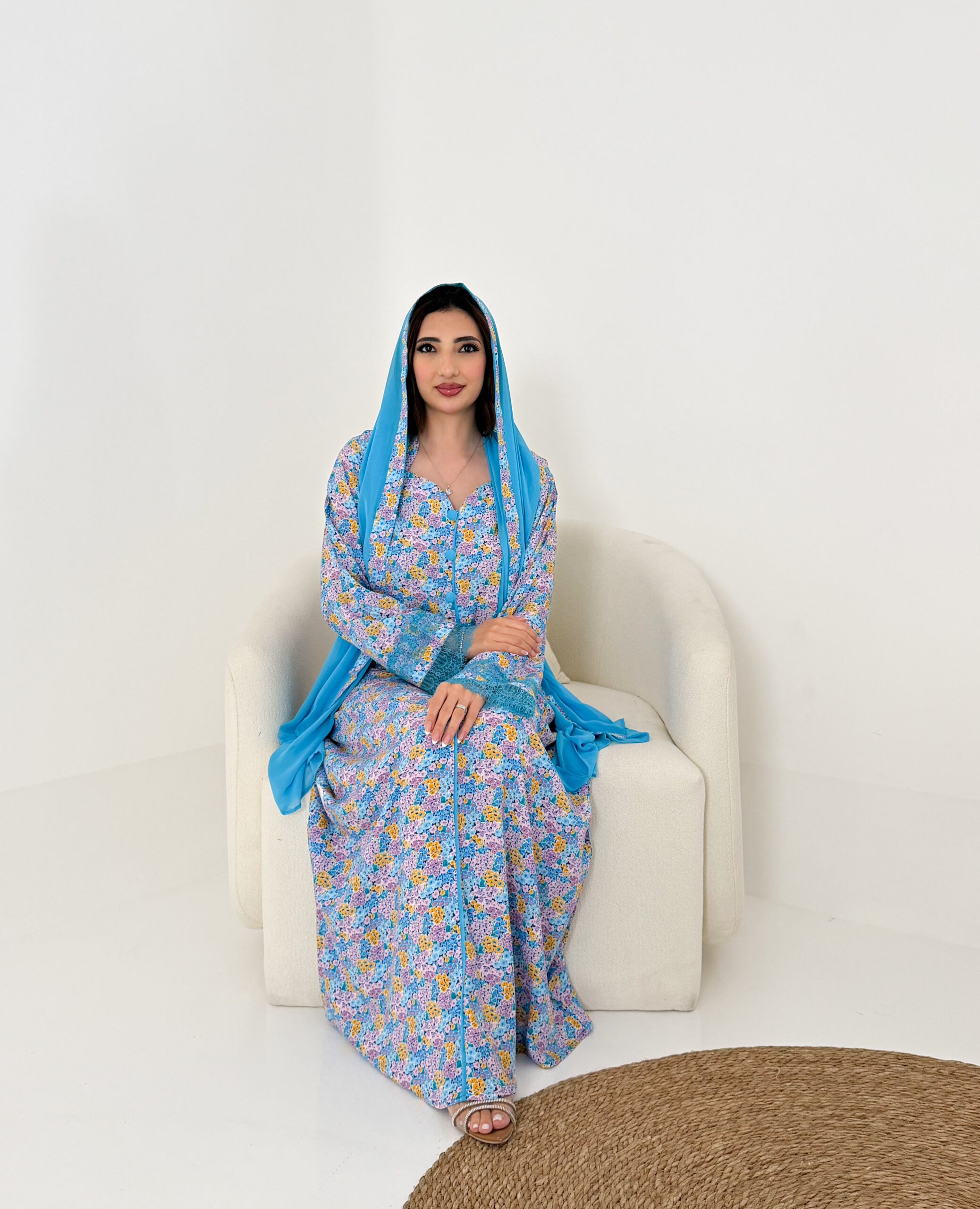 تصميم عملي وأنيق يمنحك الراحة طوال اليوم، ويأتي معها شيلة شيفون خفيفة تكمل إطلالتك بلمسة ناعمة، كما زُيّنت الأكمام بدانتيل فرنسي فاخر ليضيف لمسة أنثوية راقية.