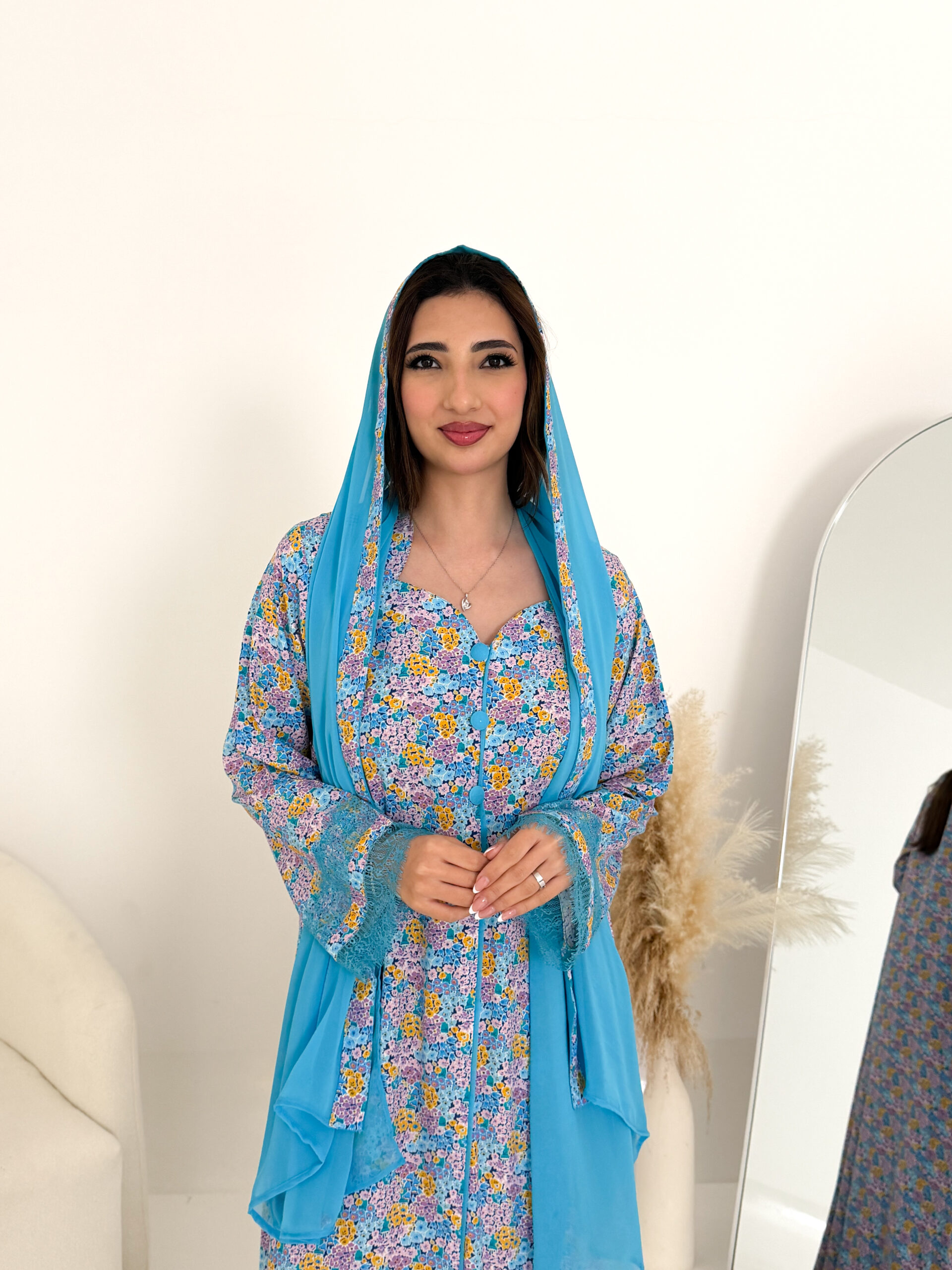 A practical and elegant design that keeps you comfortable throughout the day, complemented with a light chiffon sheila for a soft, refined look. The sleeves are adorned with delicate French lace, adding a graceful and feminine touch.